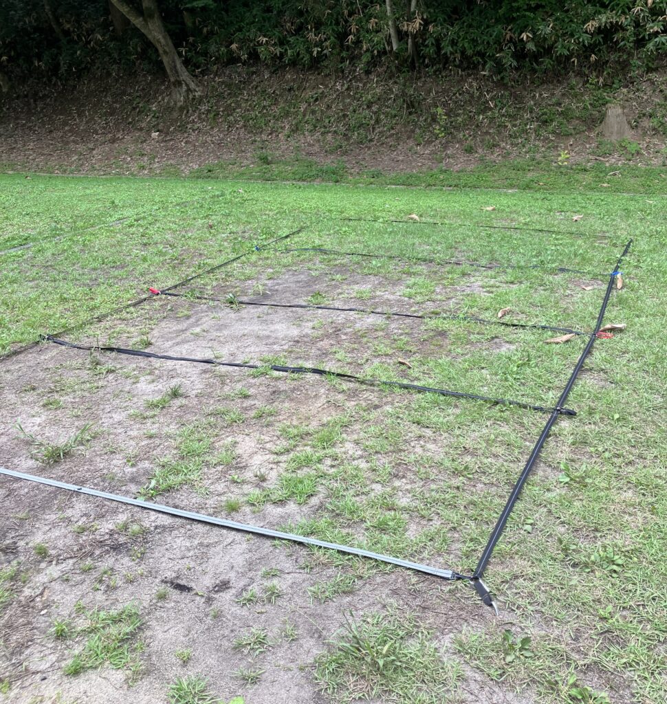 まず、設営の土台となる セルフスタンディングテープ(SSテープ) を四隅にペグで仮止めし、設営位置と向きを確定します。